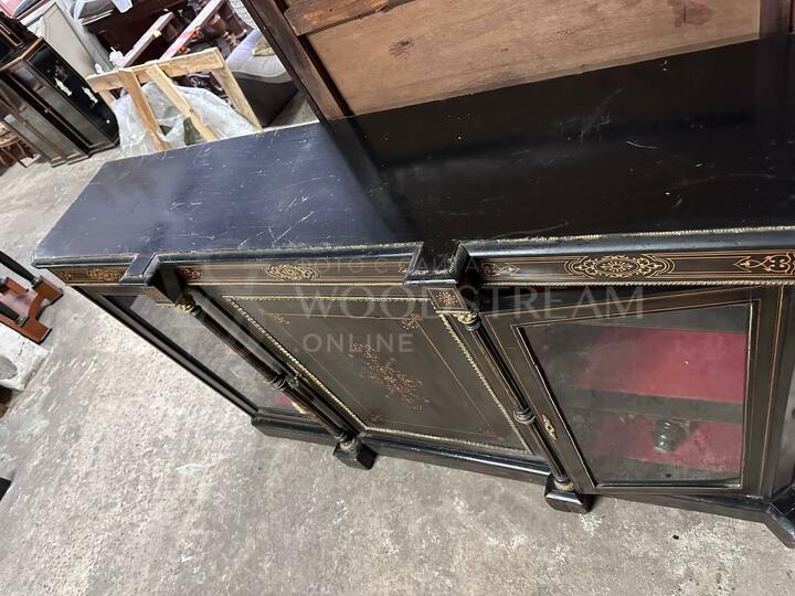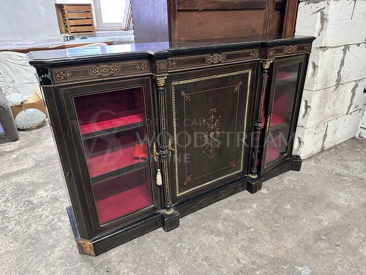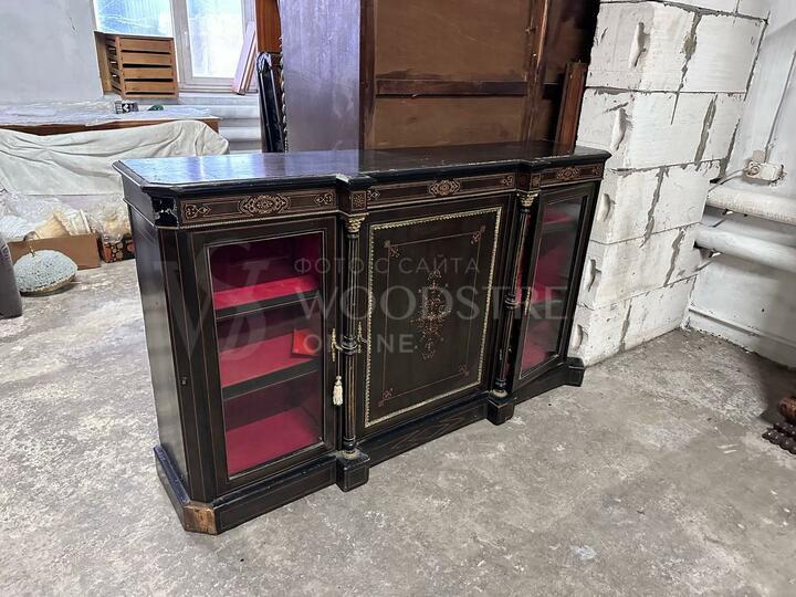 Требуется реставрация, весь латунный декор и инкрустация на месте, нужно обновить лак, ножки восстановить.