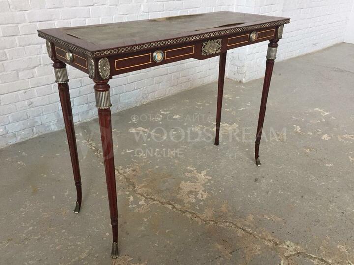 Старинный стол в стиле ампир, украшен бронзовыми накладками и медальонами из керамики. Кожаное покрытие столешницы требует ремонта