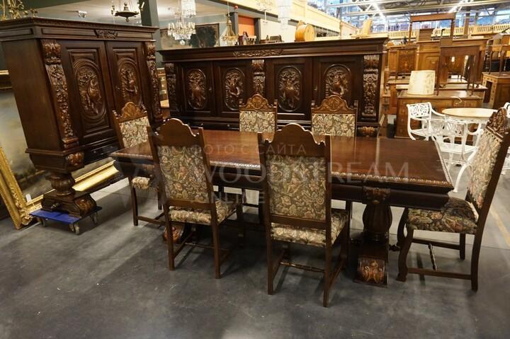 В комплект входит: барный шкаф, дрессуар, обеденный стол, 6 стульев